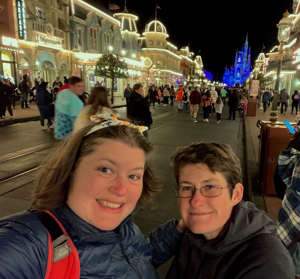 Meh also applies to cold days in Florida. As I have mentioned a few times, the first time I went, I was just in it for the winter sun and warm. And that’s what I got. The early mornings could be chilly but after that it was always very comfortable shorts and t-shirt temperature and sometimes it was actually too hot. The first time I experienced anything different was in 2009 where, for a couple of days, it was colder in Florida than in Alaska and there was a very fine sprinkling of sleety snow one early morning. Disney brought in big warm air blowers/fans to keep the little reptiles from dying and falling out of trees and I went and bought a hoodie and some thicker socks. Since then, I have been conscious that there is the possibility of a cold day or two but in 2013 and 2016 we had only warm days. In 2019 and in 2023 we did got a cold day or two. I particularly remember at the 2019 marathon weekend, on 10k day being huddled together to try and keep warm and using black bin liners over our running gear to help. Still, it was just a day or two. Today’s photo is from one of the coldest Florida days I remember. It was in 2023. We must have had a few cold days from what I remember because I was seriously considering having to buy another pair of long pants. So here we are, on Main Street USA waiting for the fireworks, feeling the cold even in our proper jackets. But we’re smiling and it was a fun evening and sometimes it really is just about deciding that you are going to enjoy it or make the most of something. So looking at this photo is making me think about what I can be happy about and enjoy right now: