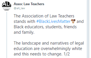 The landscape and narratives of legal education are indeed overwhelmingly white. My own history, my own education was overwhelmingly white, my world is in so many ways overwhelmingly white. So where to start. Of course I would like to think I am not racist and I would hope that in many ways I am anti-racist but I am also a white relatively privileged woman and therefore so much part of a global system and lots of national and local systems that are fundamentally racist. There are so many things here that I could write about and I know very little about all of them. As the #BlackLivesMatter protests continue and calls for white people to educate ourselves and do better increase, I think it is really important that we don’t all suddenly start pretending we know about race. It’s our time (and well overdue!) to shut up, listen and learn. So here I want to reflect on what all of this might mean for me as a law teacher. And by ‘all of this’ I mean, my emotional reaction to the murder of George Floyd and the protests which have followed, the call to learn more, the call for solidarity that is more meaningful than a building lit in purple for one night and a call for action which genuinely supports black and brown people in their protests and struggles, which amplifies their voices and helps to make them heard.