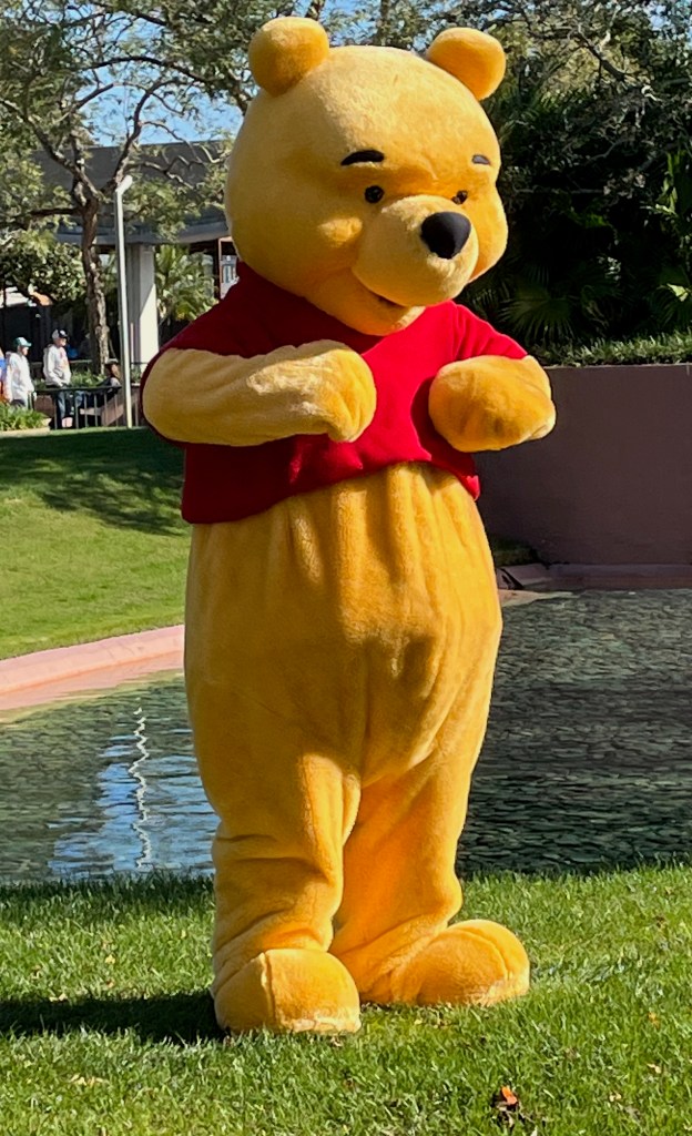 Here’s the Bear of Little Brain. This was taken at Epcot in January 2023 as he was doing his morning exercises. We stood and watched him for ages and got the giggles watching him trying to reach his toes. My anxiety has been sky high today and I have felt very ‘little brained’. I probably could have done with channeling Winnie a little more. Or just the feeling of standing and watching him. In fact I don’t think any of us really take enough time to just stand and stare or watch or just be. It’s all about productivity and that just ends up being counter productive because my work world should be about creativity and thinking and empowerment and inspiring others and none of that works well if my tank is empty. Winnie started his day with some exercise and some waving at crowds and some being silly and just the memory of that starts resetting my system and bringing my heart rate and anxiety levels down. I finished my day today with a Boxercise class at the gym. It felt good – sometimes you just need to punch the crap out of something to release the excess adrenaline – and there were some giggles too over my lack of co-ordination. The fact that I nearly passed out at the end and had to sit on a chair off to one said that felt rather like the naughty chair, is also a reminder to look after myself better during the day. Maybe pause, have lunch, drink water, drink less coffee… I can’t imagine Winnie not having a little smackerel of something at regular intervals!